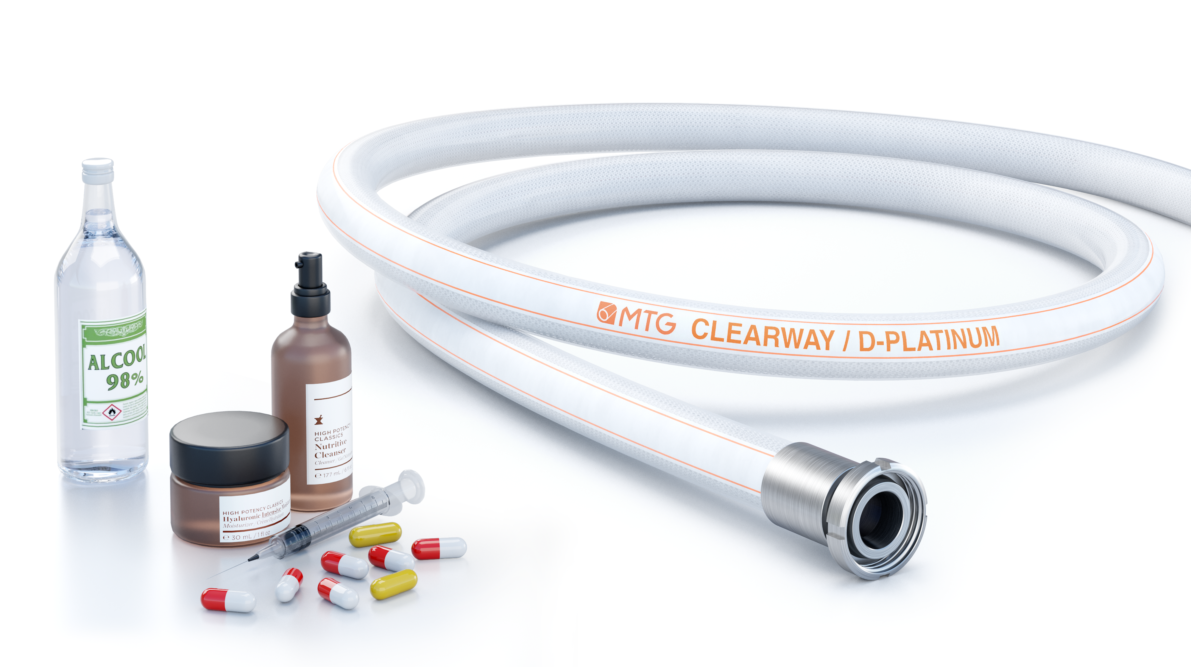 Silicone hose for delivery of high purity products, foodstuff and fluids with alcohol content up to 96%.